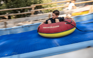 Installez vous confortablement dans votre bouée et dévalez la butte à toute allure.