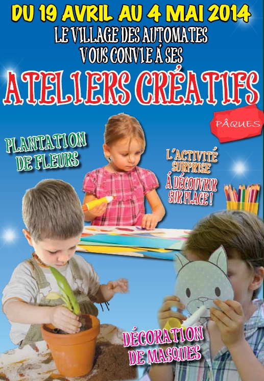 Le printemps est là et c’est le moment de faire découvir à vos enfants les ateliers créatifs que nous leurs proposons pour les vacances de Pâques. Tous les jours, du samedi 19 avril au dimanche 4 mai, ils pourront planter une fleur, décorer un masque et participer à une activité surprise au village des Automates!!! Les enfants repartiront avec toutes leurs créations!!!