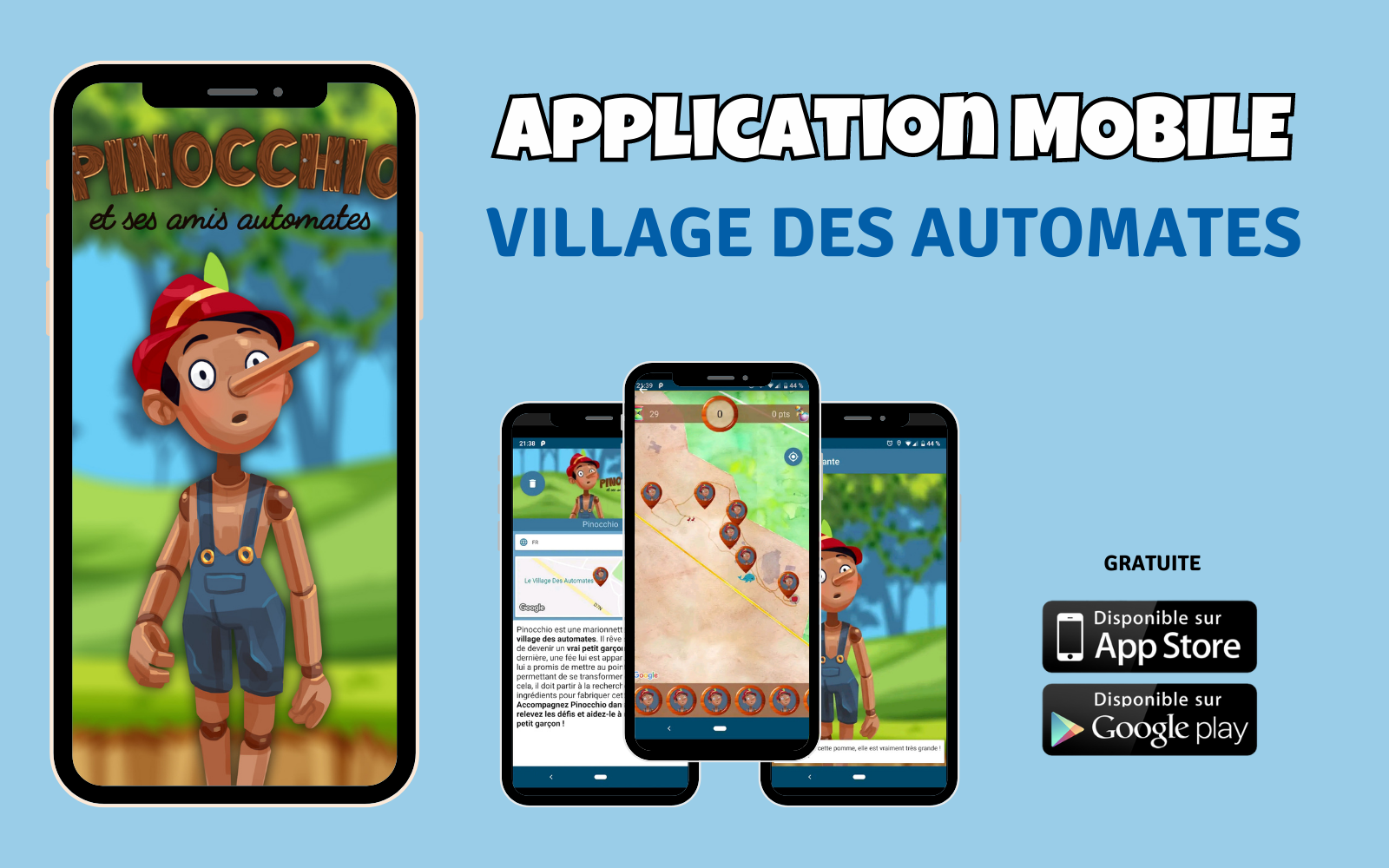 Téléchargez l’application mobile VILLAGE DES AUTOMATES et venez vous amuser avec Pinocchio !